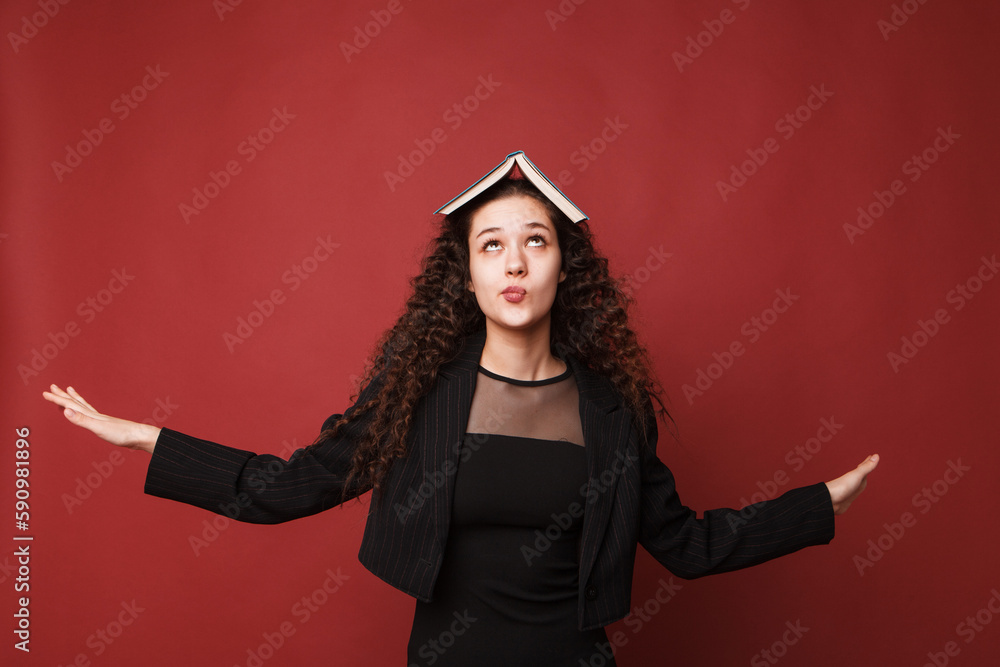 fashion female portrait. Girl, curly girl with black hair in a strict business suit on a red, pink background. High quality photo. Female student rejoices, happy and thoughtful with a book on her head
