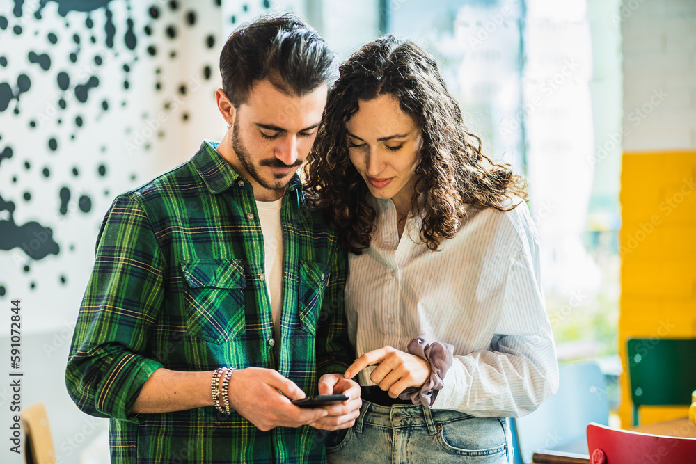 Young couple using their cellphone to surf the internet