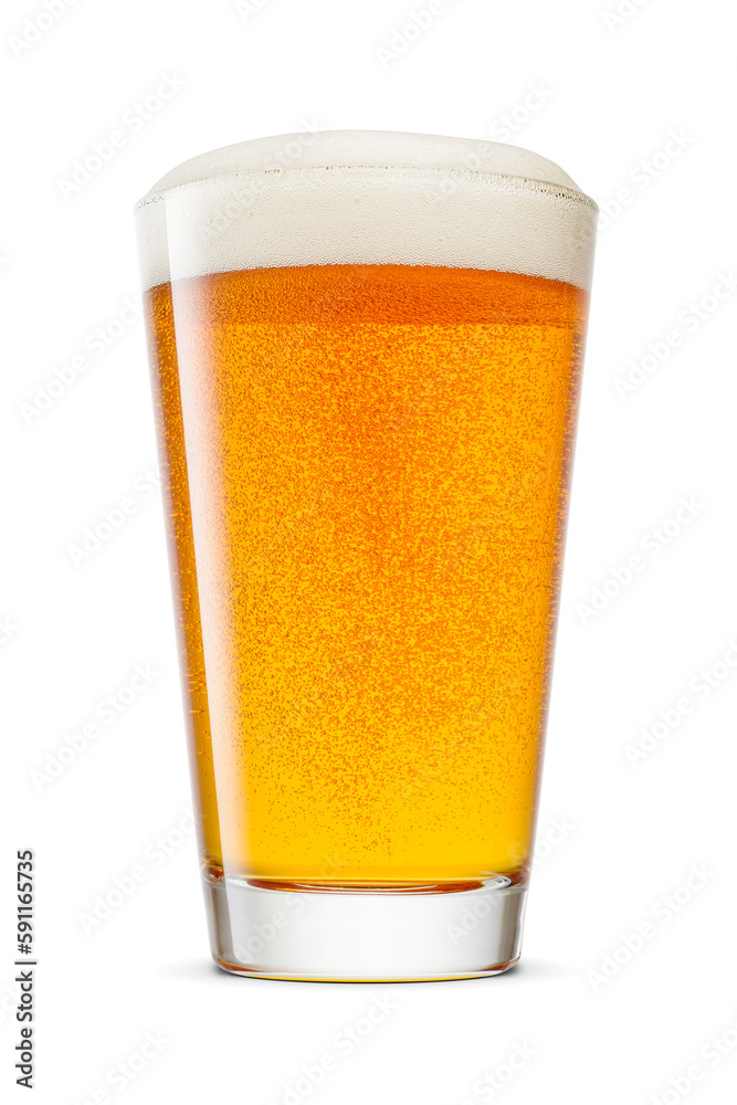 Glass of fresh golden-colored beer with cap of foam isolated on white background.