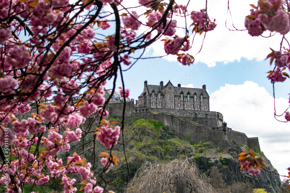 Floración de cerezos frente al Castillo de Edimburgo. Concepto de primavera en Escocia. Flores del cerezo.