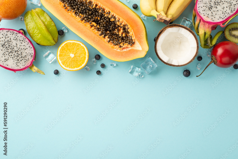 Tropical delight concept. Top view of fresh exotic dragon fruit, tomarillo, papaya, orange, carambola and coconut with on a pastel blue background with an empty space for marketing