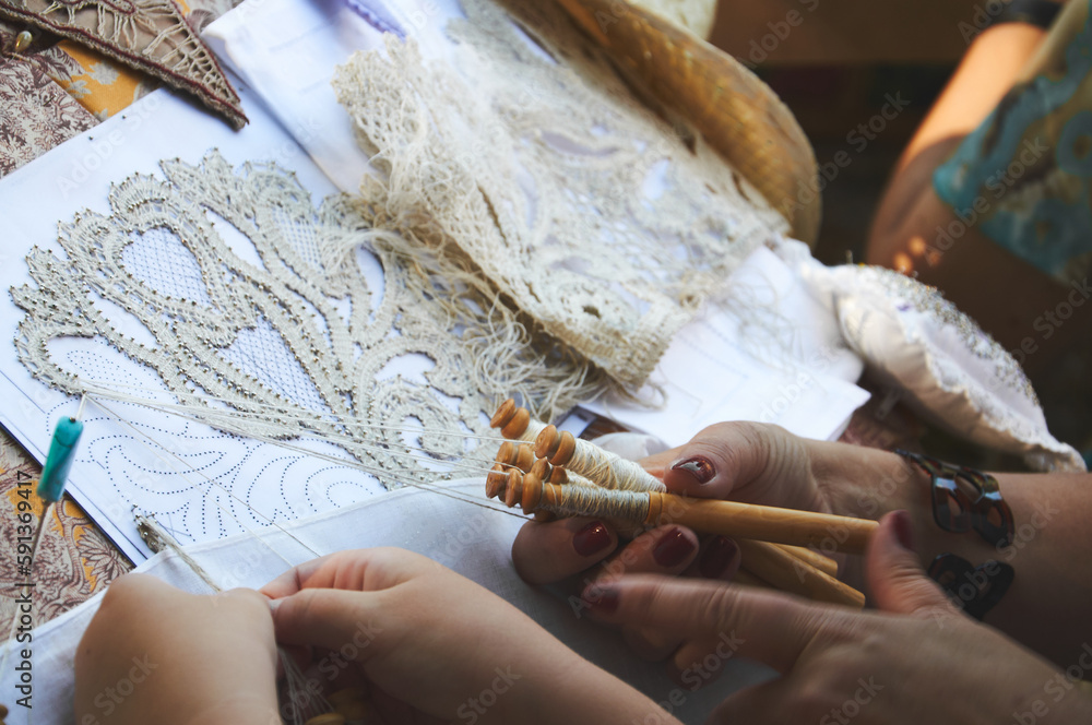 Close-up photo of a woman and a girl making lace using bobbins