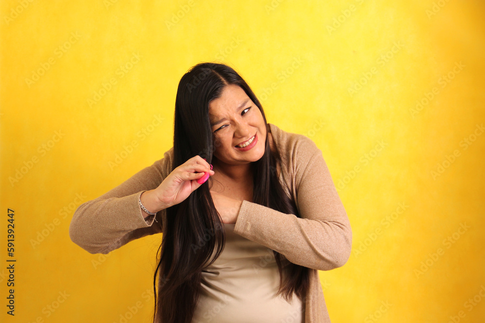 Latin adult woman with very long straight hair troublesomely brushes her hair with hairbrush that is dry, damaged, tangled with knots