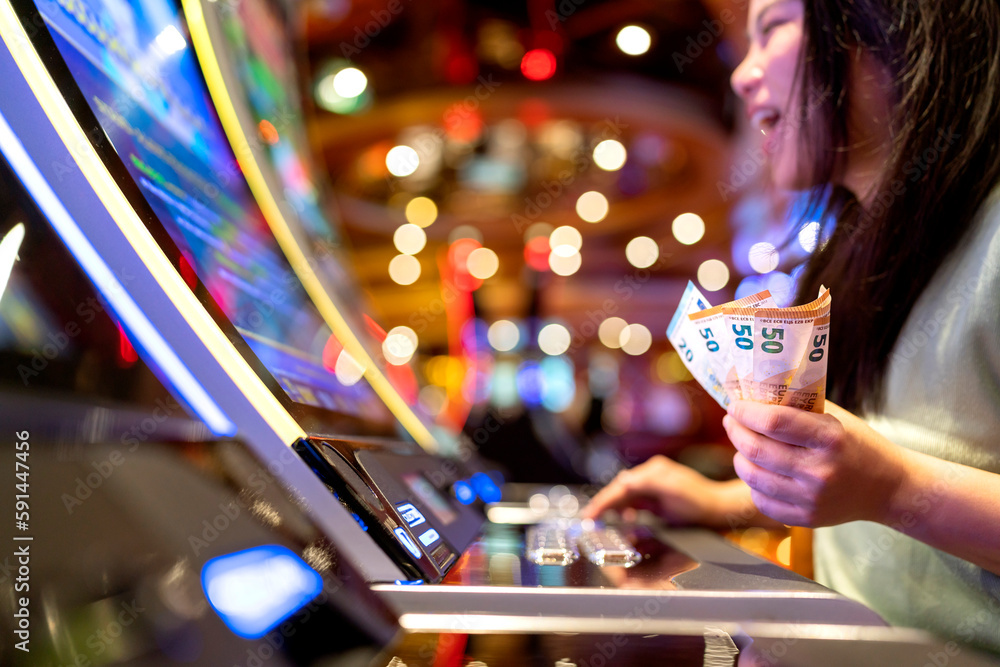 Slot Machine Play Time. Female Gambler Hand hold money bill ready to win the game with one best shot casino close up,vacation leisure relax exited in casino concept