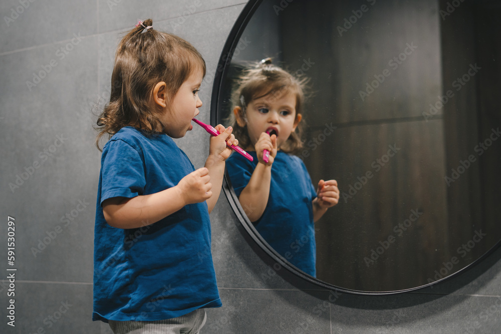Baby girl brushing teeth with toothbrush as daily kids routine and self care procedure, looking in the mirror. Kids dental hygiene. Child health care.