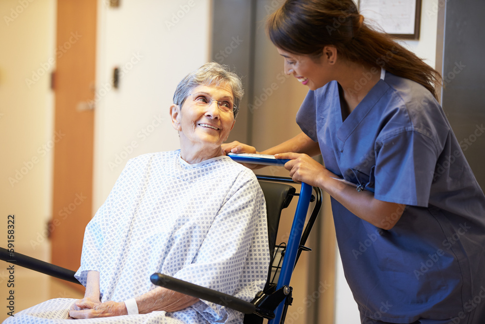 Senior Female Patient Being Pushed In Wheelchair By Nurse