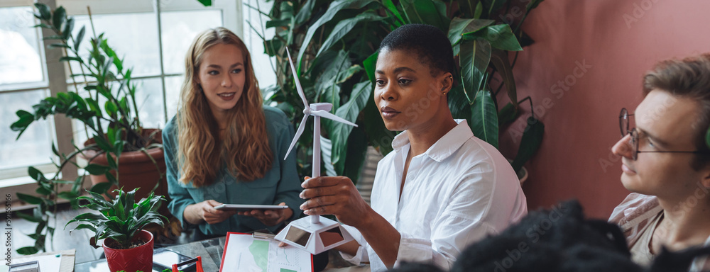 Diverse group of international students working on the urban project of modern city with renewable energy source, green areas. Concept of ecology, environment, waste recycling, technology. Banner