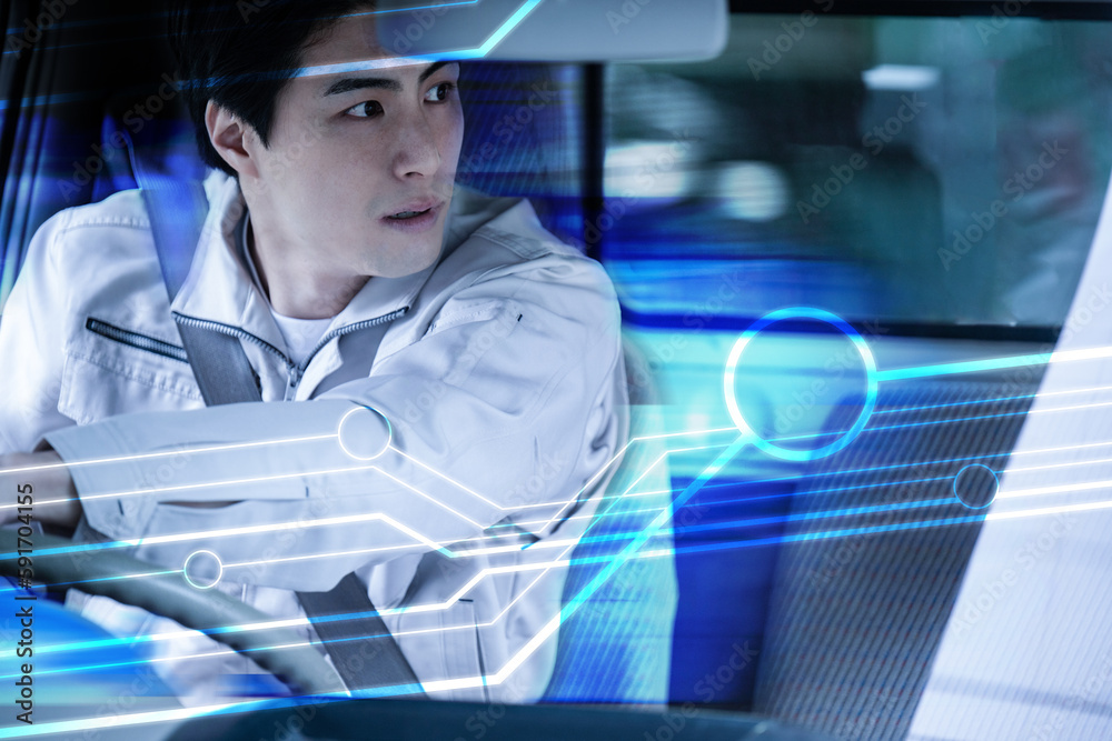 メインビジュアルにも!流通や配送のDXなどIT化など生産の効率化を推進するカッコイイ作業員のイメージ コピスペースあり