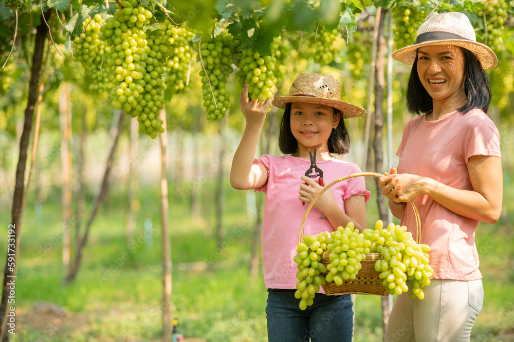 happy asian family traveling backpacker, Mother and daughter traveler standing in beautiful vineyards in autumn harvest with freshly grapes. vineyards at sunset in autumn harvest. ripe grapes in fall.