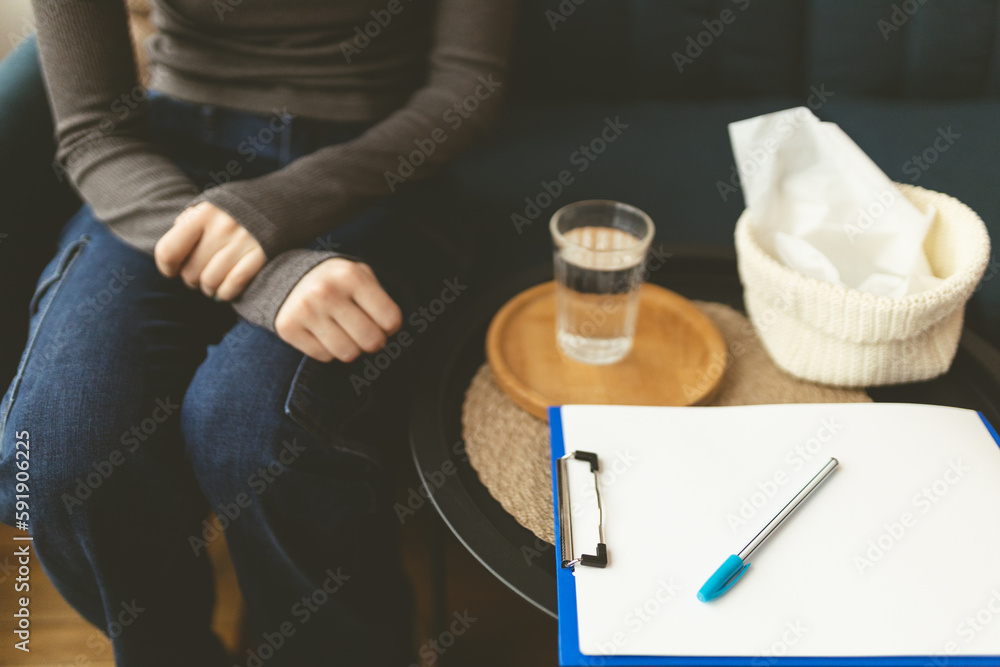Psychologist's office. Close-up of glass of water, clock and napkins on sofa. Comfortable sofa. Atmosphere for a psychotherapy session. Treatment of depression.