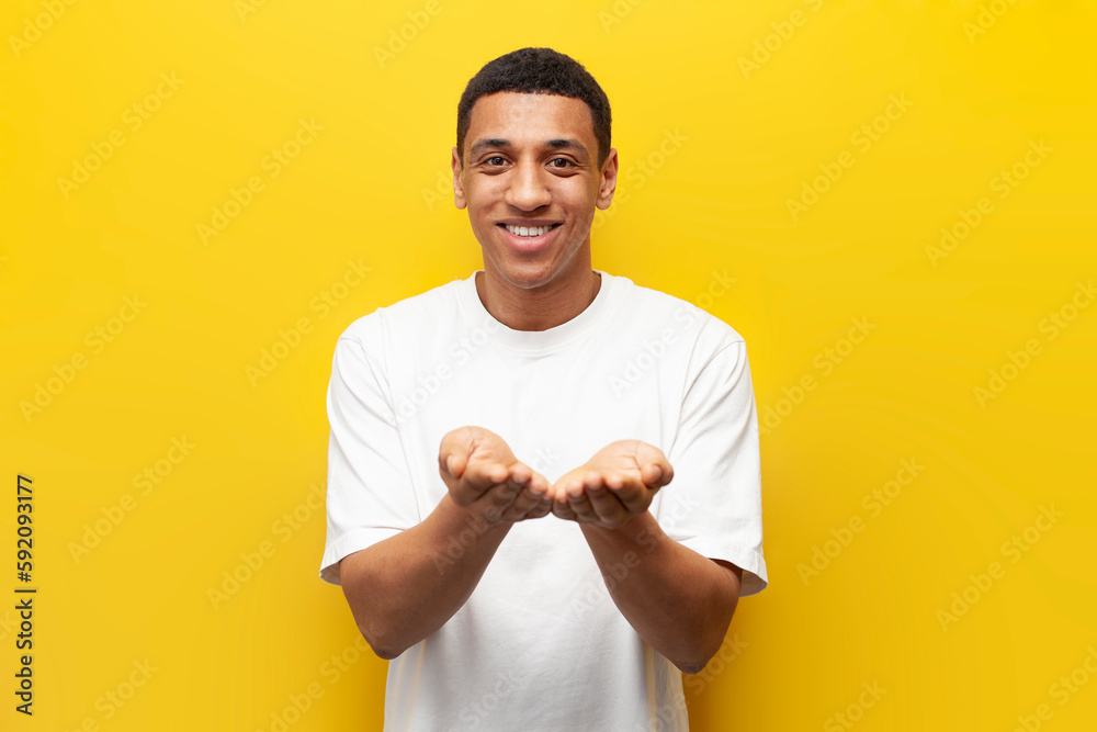 young African American guy holds his hands in front of him on yellow isolated background, man holds nothing