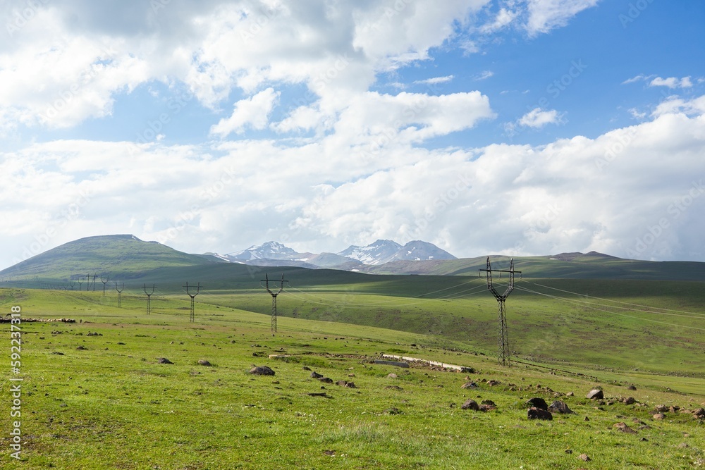 Green valley view with a spiral of power lines Aragats mountain stuck into white clouds background
