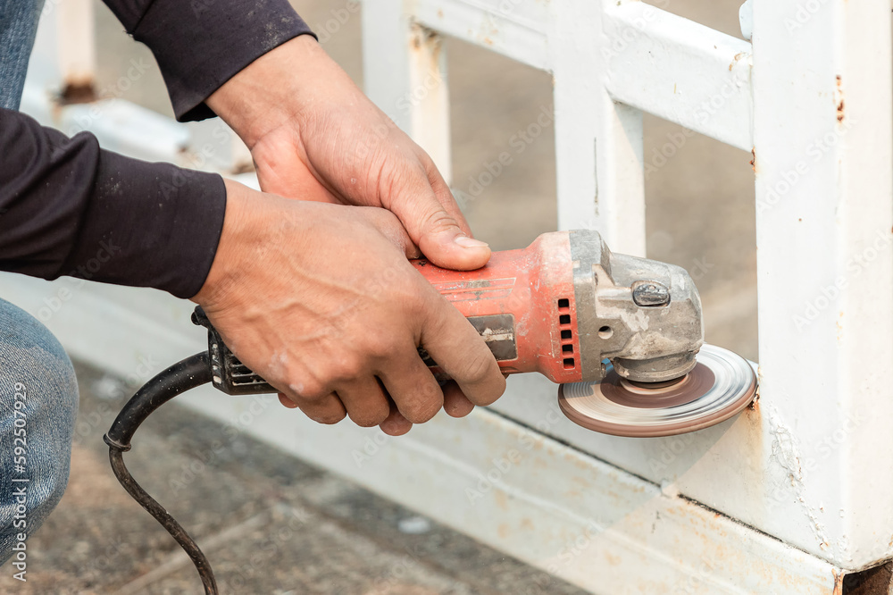 Tradesman uses an electric grinder to attrition on the iron door.