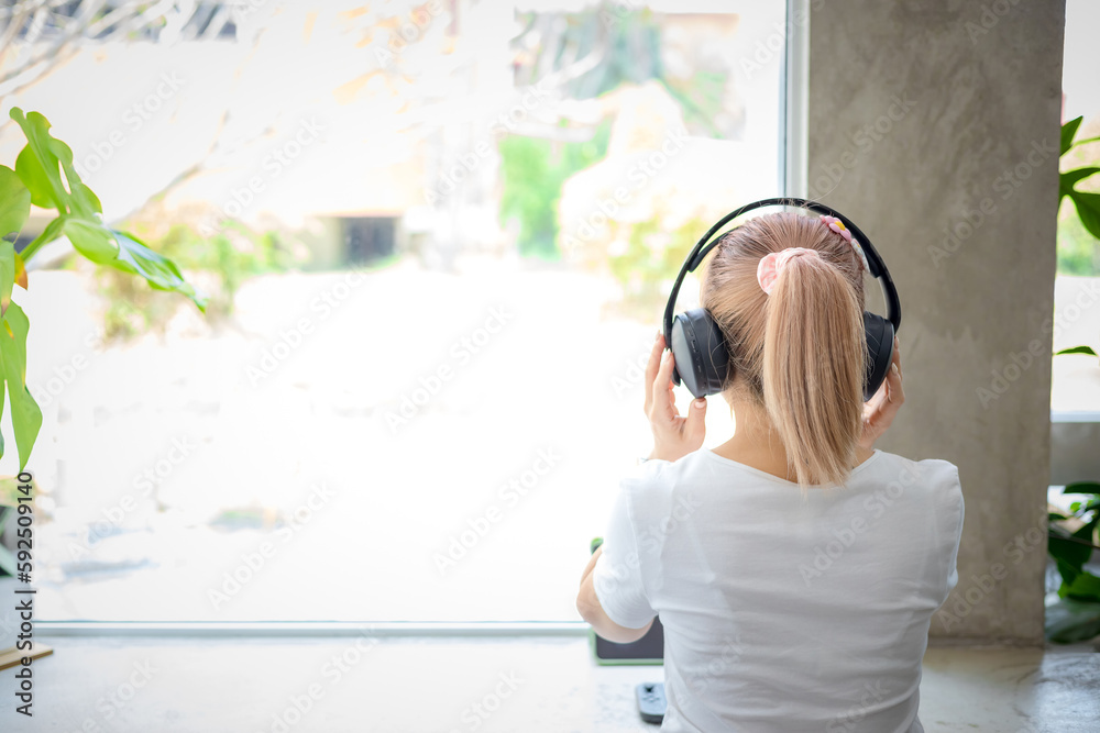 Portrait of a relaxed woman listening to music with headphones while sitting in a cafe