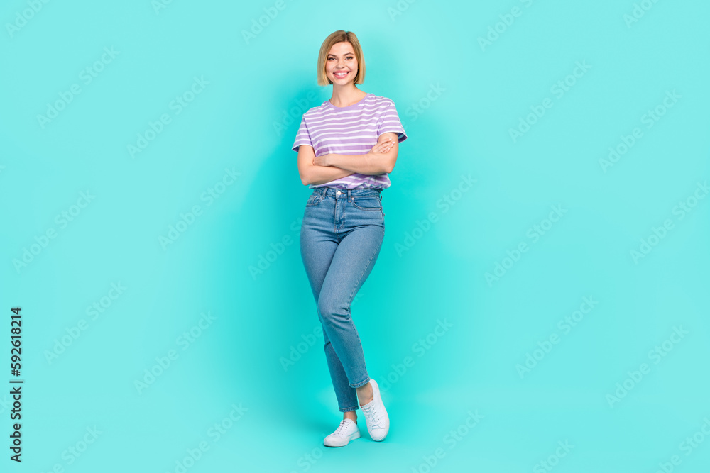 Full body photo of young profession project manager wear jeans folded arms enjoy her job dress code isolated on aquamarine color background