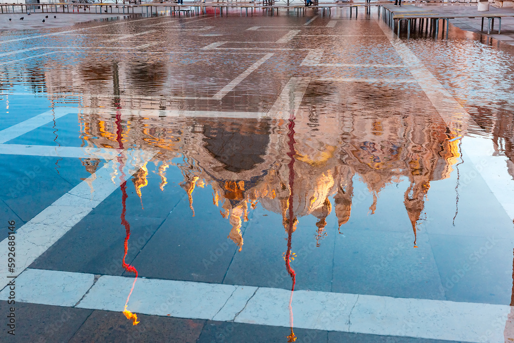 Piazza San Marco, St Mark Square at sunrise, deluged by flood water during High water, Venice, Italy