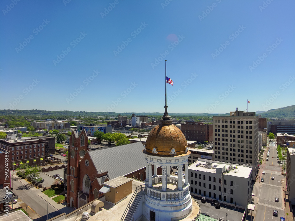 aerial shot of the golden dome on top of The Dome Building with an American flag on top with churches, office buildings, lush green trees and cars driving on the street in Chattanooga Tennessee USA