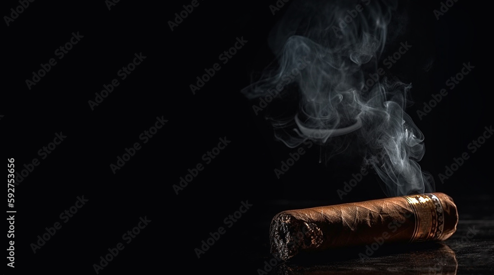 burning brown cigar with smoke on black background with copy space, Cuban cigars,robusto
