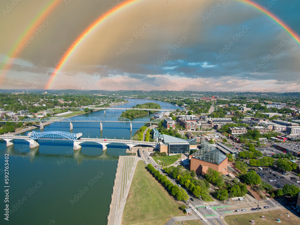 aerial shot of the Tennessee River, the Walnut Street bridge and Veterans Memorial Bridge over the water surrounded by lush green trees and buildings with blue sky, clouds and a rainbow in Chattanooga