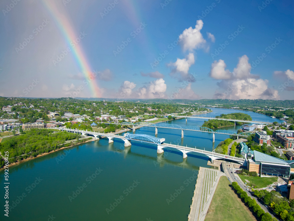 aerial shot of the Tennessee River, the Walnut Street bridge and Veterans Memorial Bridge over the water surrounded by lush green trees and buildings with blue sky, clouds and a rainbow in Chattanooga