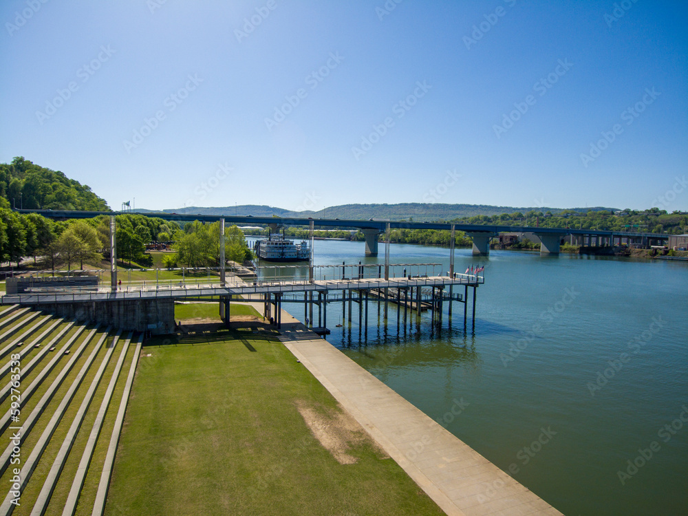 aerial shot of Ross's Landing along the Tennessee River with lush green grass and street, river boats docked on the water and gorgeous clear blue sky in Chattanooga Tennessee USA
