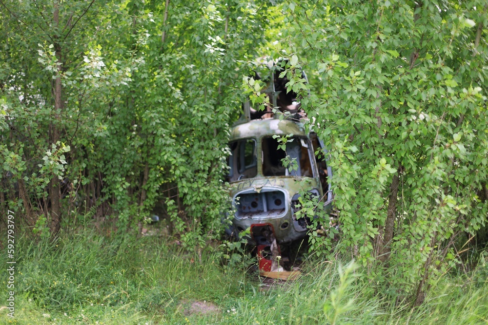 the abandoned ruins of a helicopter surrounded by green bushes and grass. Abandoned helicopter, abandoned plane