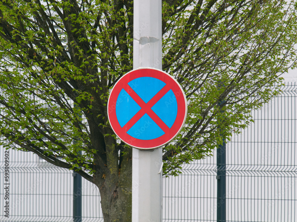 Close-up photo of No Parking traffic sign on a metal pole with the tree in the background