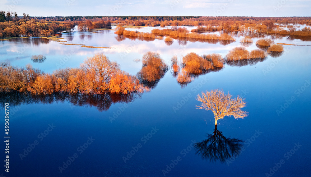 Spring flood rural landscape. Trees, meadow, bushes, fields, country road under High Water inundation. Sky, clouds reflection in evening light. Freshet Overflow aerial view. Floodplain area.