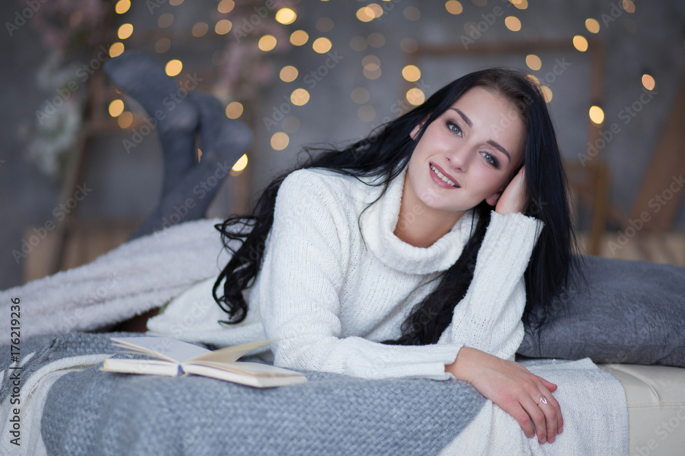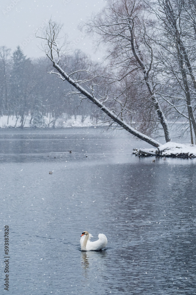 White swan swims on the lake in winter in a snowfall. Concept of the International Day of Birds. Birds in the winter. Vertical view.
