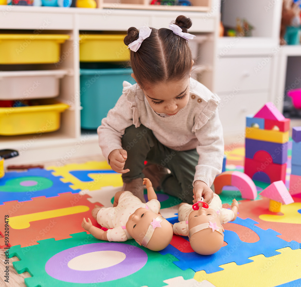 Adorable hispanic girl sitting on floor playing with baby doll at kindergarten