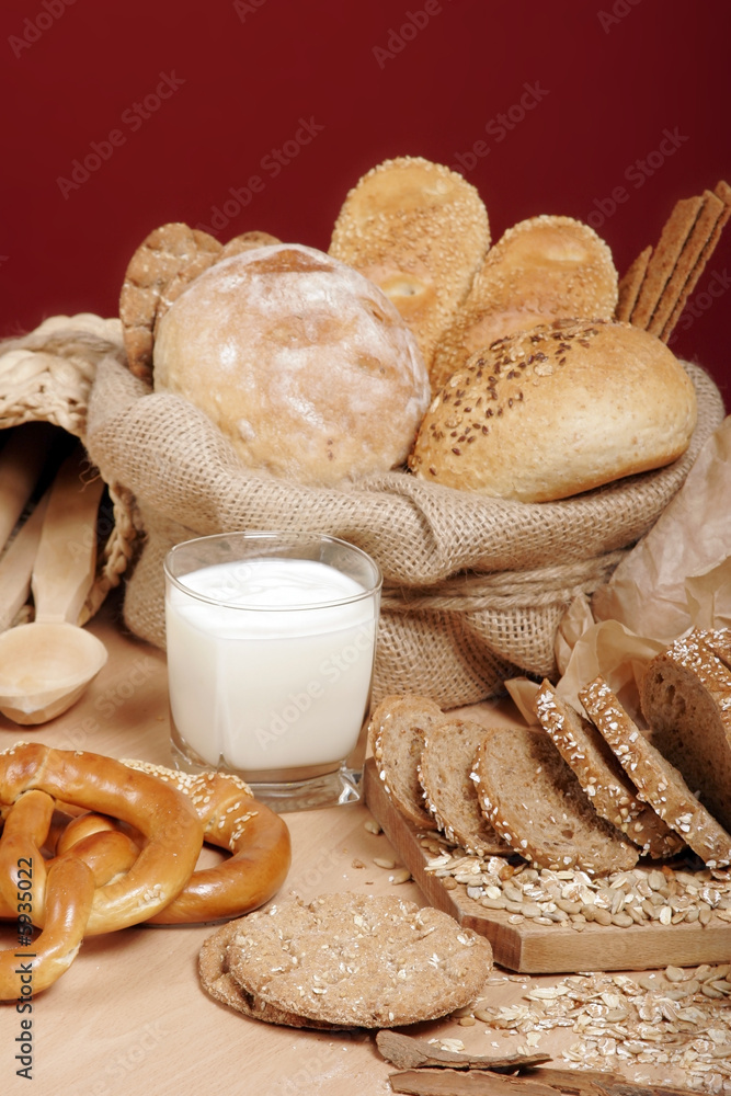 Assortment of baked breads and pretzels with a cup of yoghurt