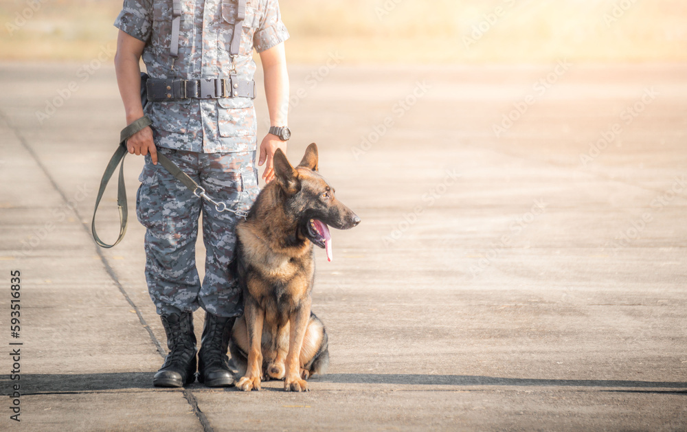 Soldiers from the K-9 unit demonstrations to attack the enemy , the green lawns. learn the human language. Dogs can follow orders well.