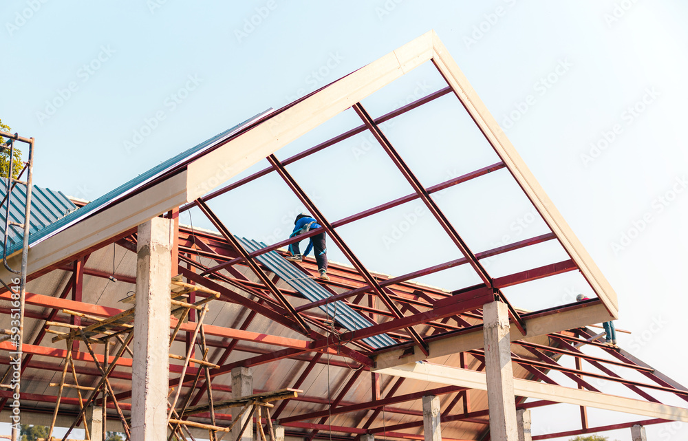 Roofer working in special protective work wear gloves, using air or pneumatic nail gun installing asphalt shingle on top of the new roof.