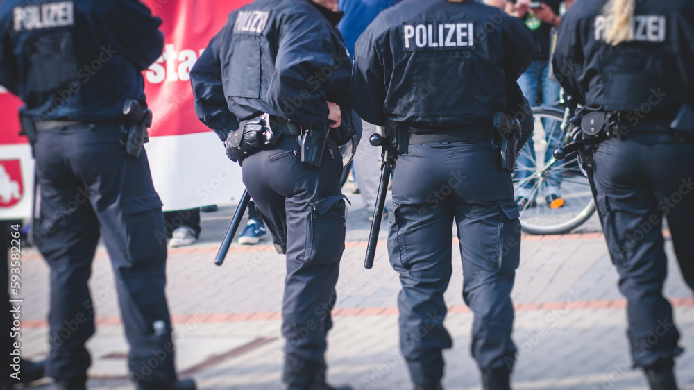 German police squad formation in protective gear with "Police" logo on uniform maintain public order after football game and political protest rally in the streets of Berlin city center, Germany