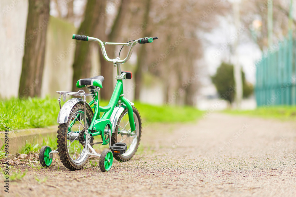 A green bicycle for children with additional wheels at road in park