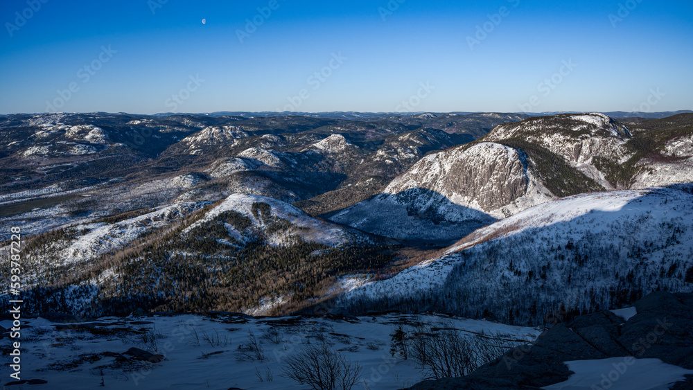 Morning sunlight over a sea of snow covered mountains, Grands-Jardins national park, Charlevoix, QC, Canada