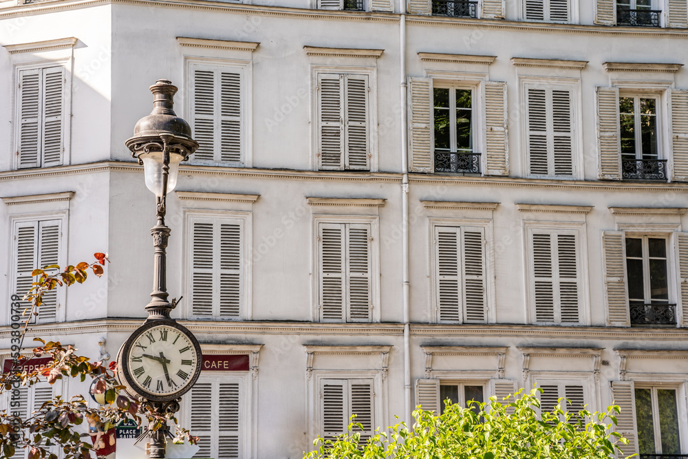 In Paris, France, a clock face on a street lamp in front of beautiful, traditional architecture in Montmartre.