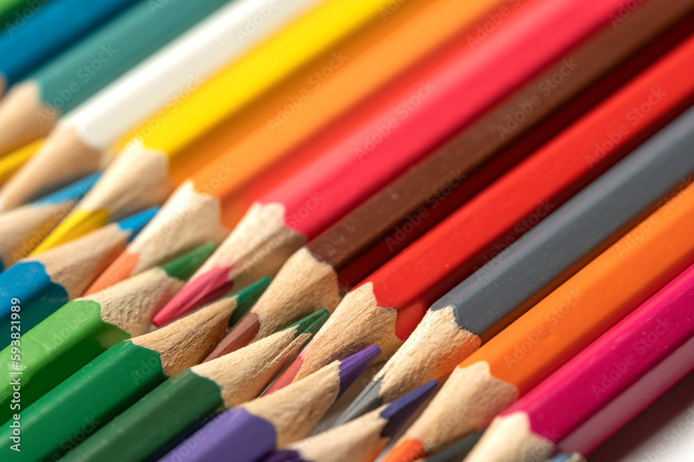Colored pencils lie in a row. A line drawn with pencil tips. Set of crayons for illustrations, art, study. Ready for school.