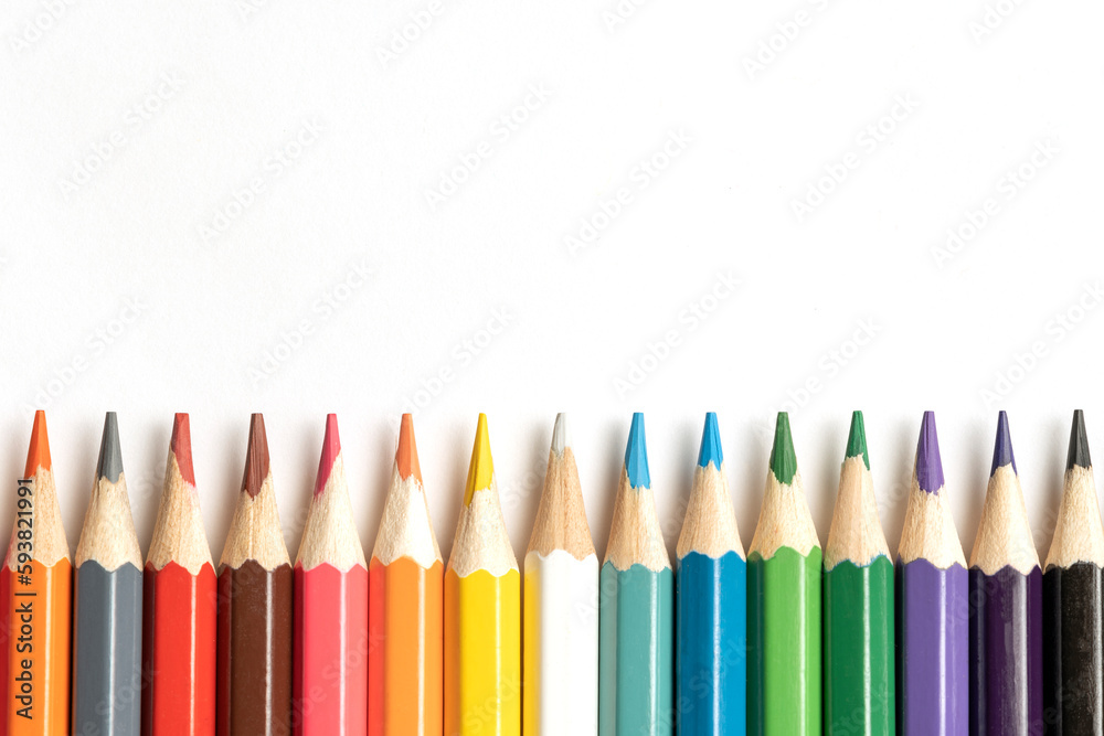 Colored pencils lie in a row. A line drawn with pencil tips. Set of crayons for illustrations, art, study. Ready for school.