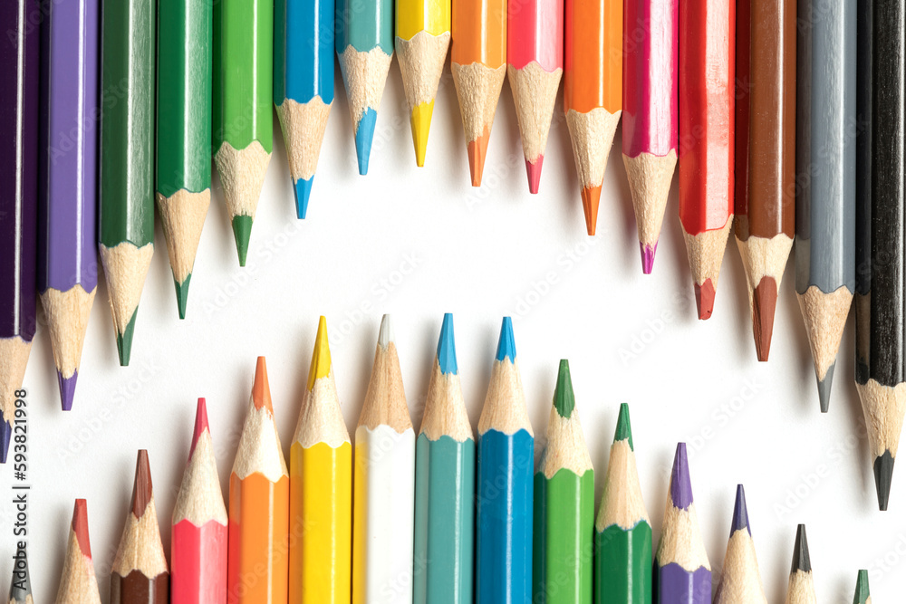 Colored pencils lie in a row. A line drawn with pencil tips. Set of crayons for illustrations, art, study. Ready for school.