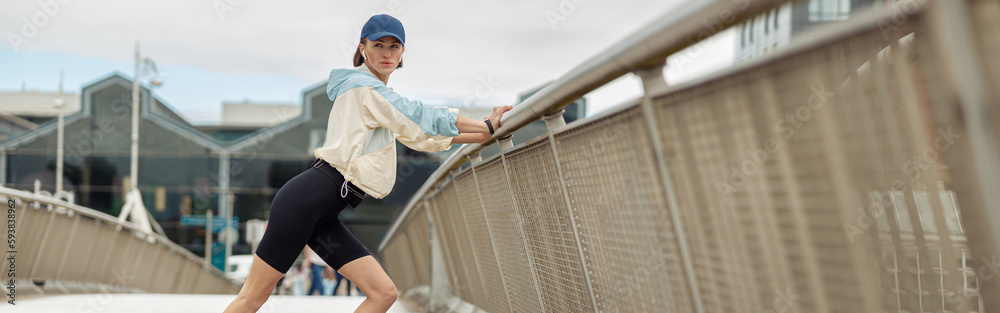Beautiful sportive woman doing stretching exercise on footbridge in the city