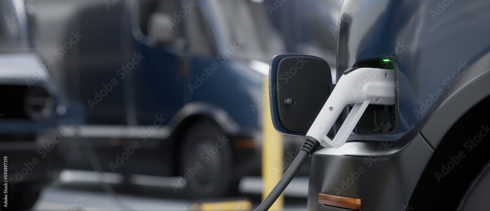 CU shot of fleet modern electric EV delivery vans are being charged in company parking garage