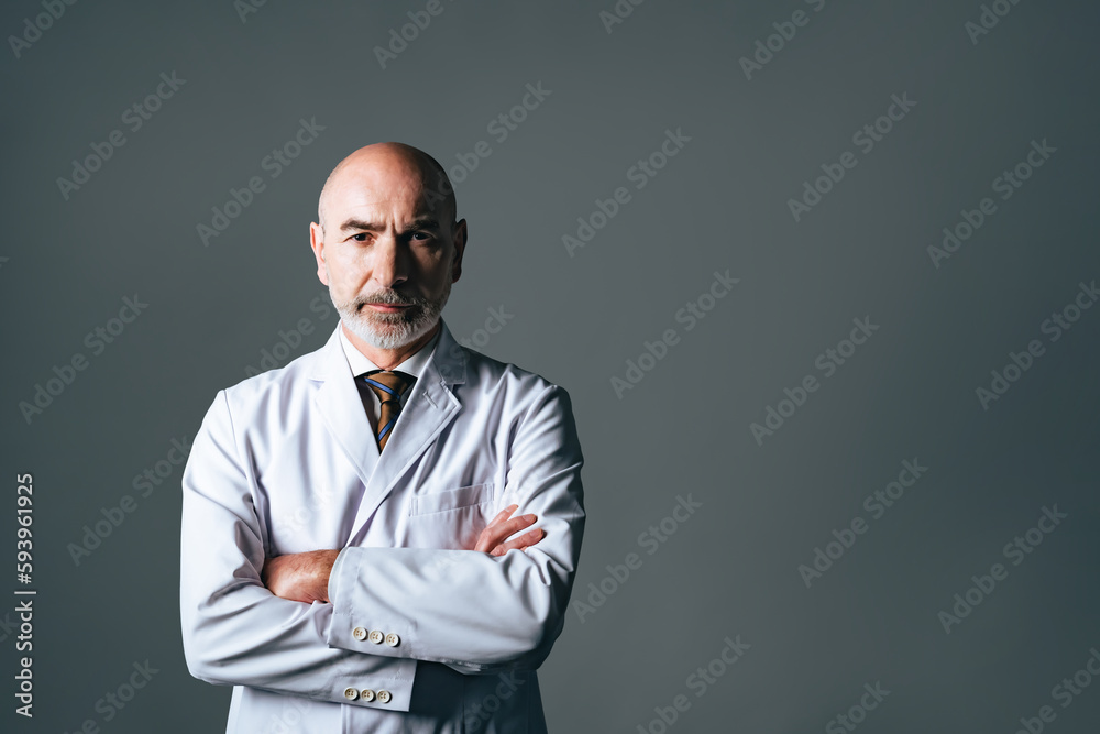 Portrait of a senior man wearing a white coat. Doctor. Professor.