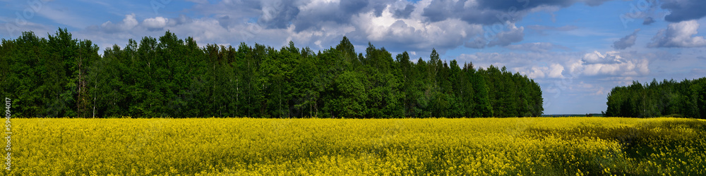 agricultural field with yellow flowering rapeseed and green forest under a blue cloudy sky. widescreen panoramic side view