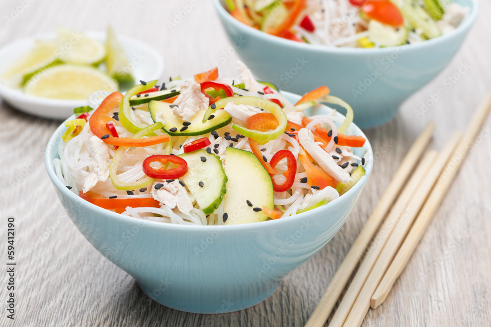two bowls of Thai salad with vegetable, rice noodles and chicken