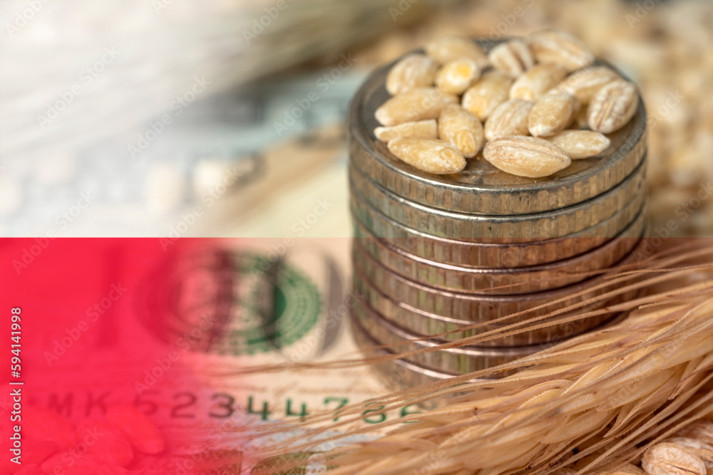 Polish flag on a grain background with coins close-up. Export of wheat and grain. World food crisis. Export logistics solution