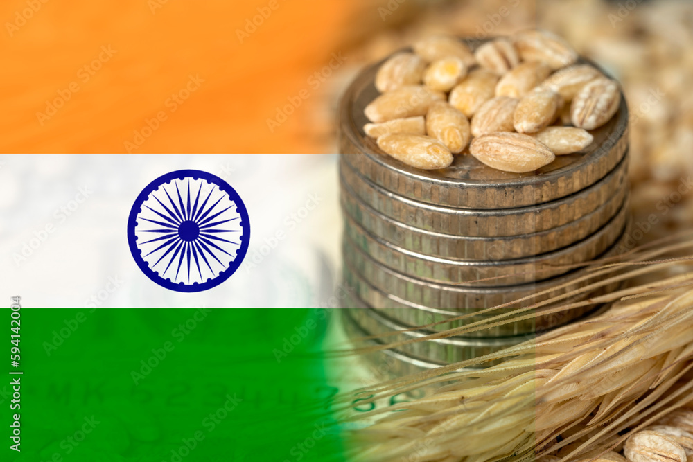 Indian flag on grain background with coins close up. Export of wheat and grain. World food crisis. Export logistics solution