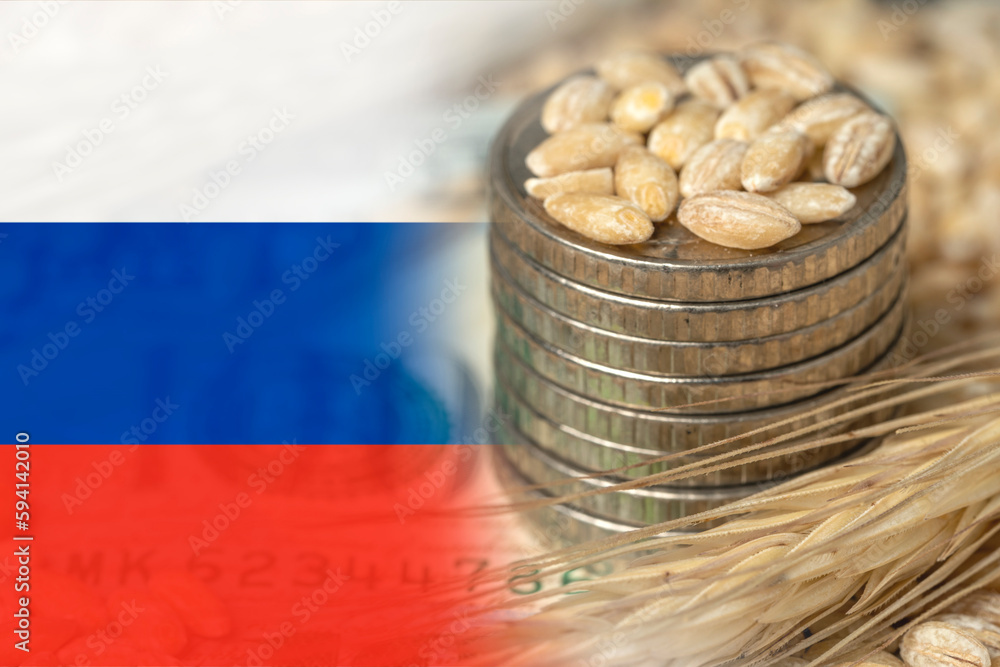 Russian flag on a grain background with coins close-up. Export of wheat and grain. World food crisis. Export logistics solution