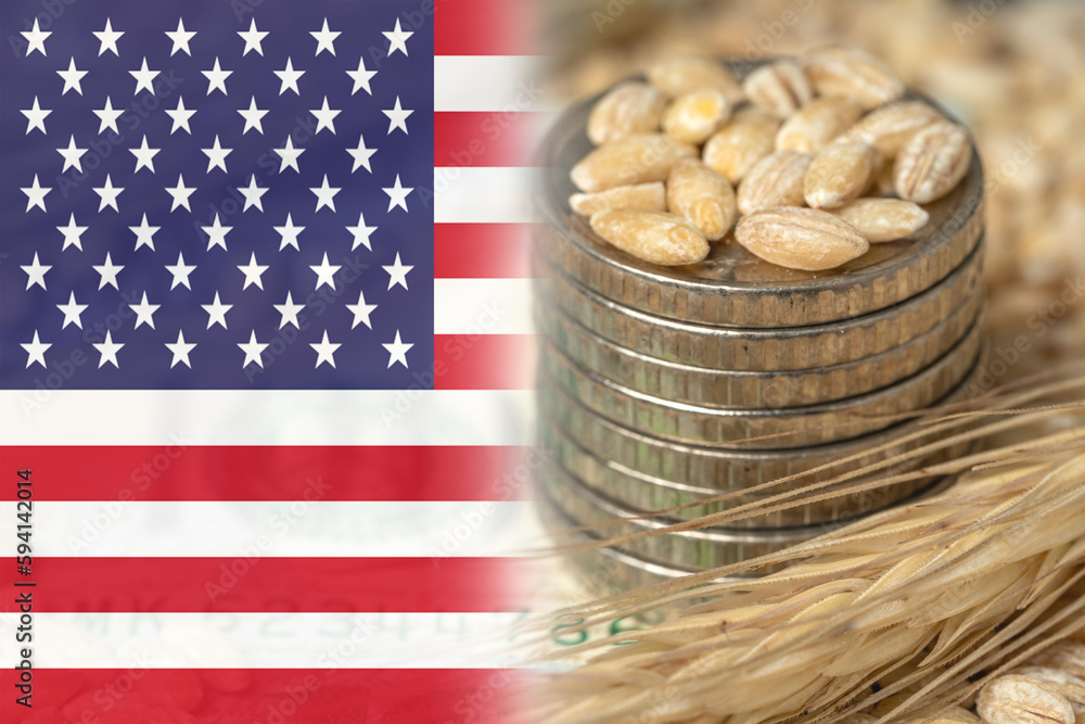 American flag on grain background with coins close up. Export of wheat and grain. World food crisis. Export logistics solution