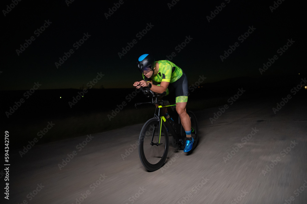 A triathlete rides his bike in the darkness of night, pushing himself to prepare for a marathon. The contrast between the darkness and the light of his bike creates a sense of drama and highlights the